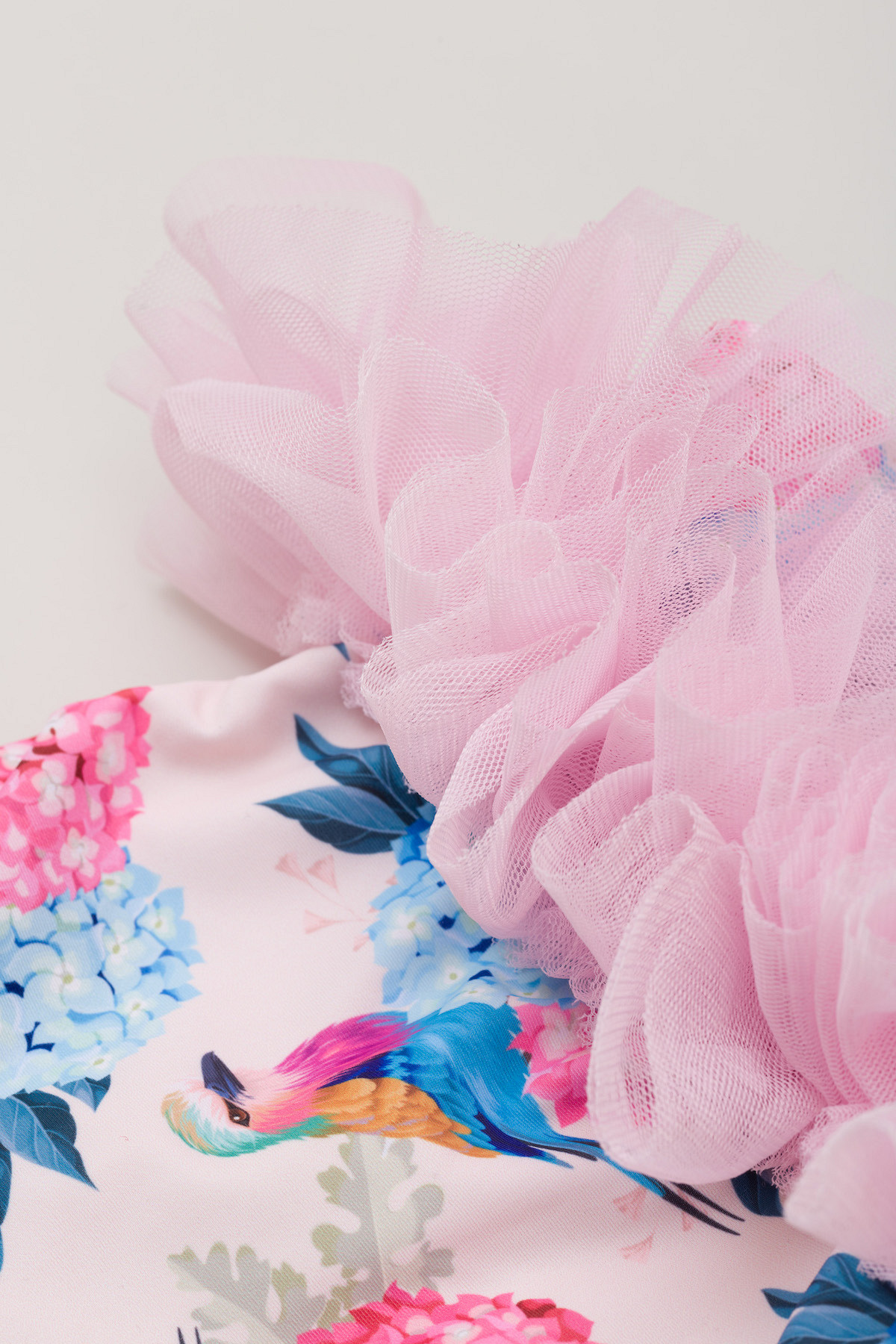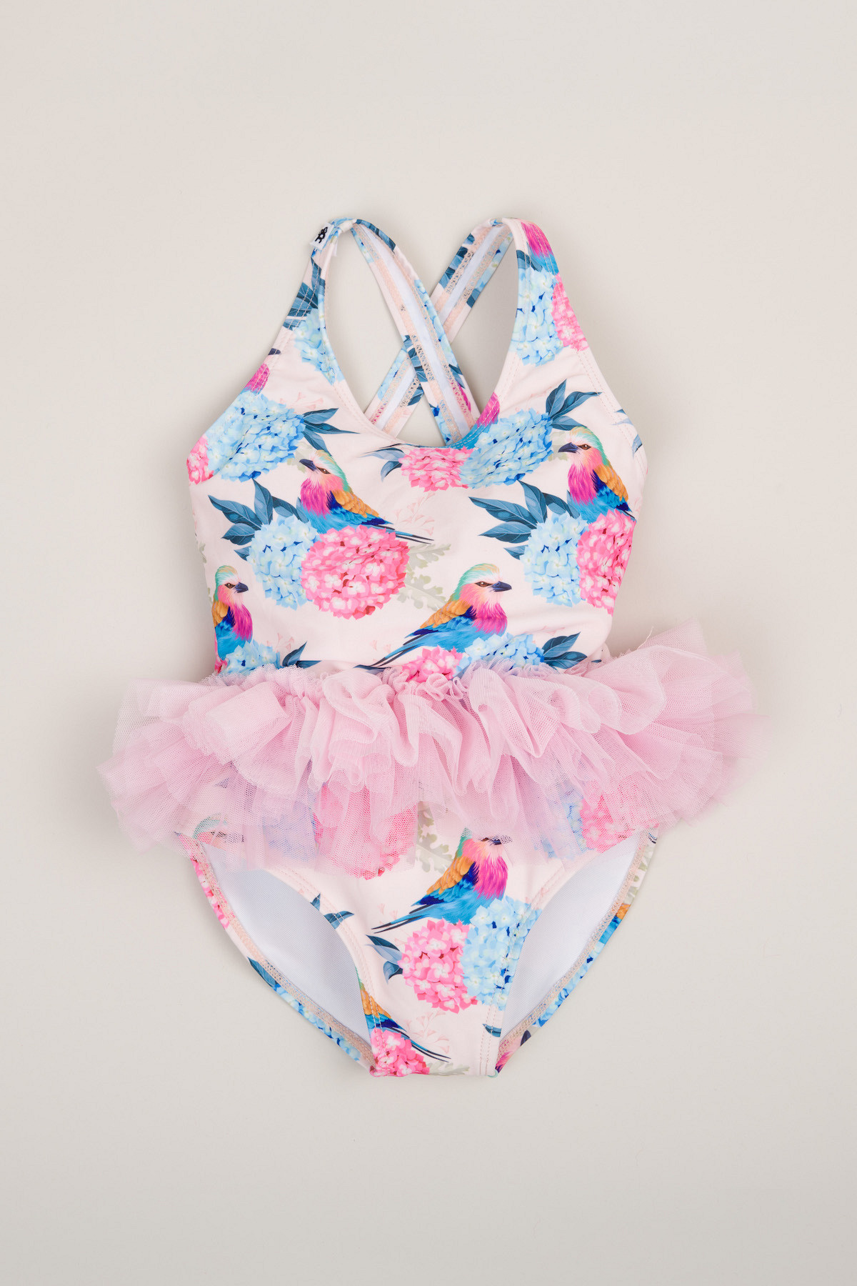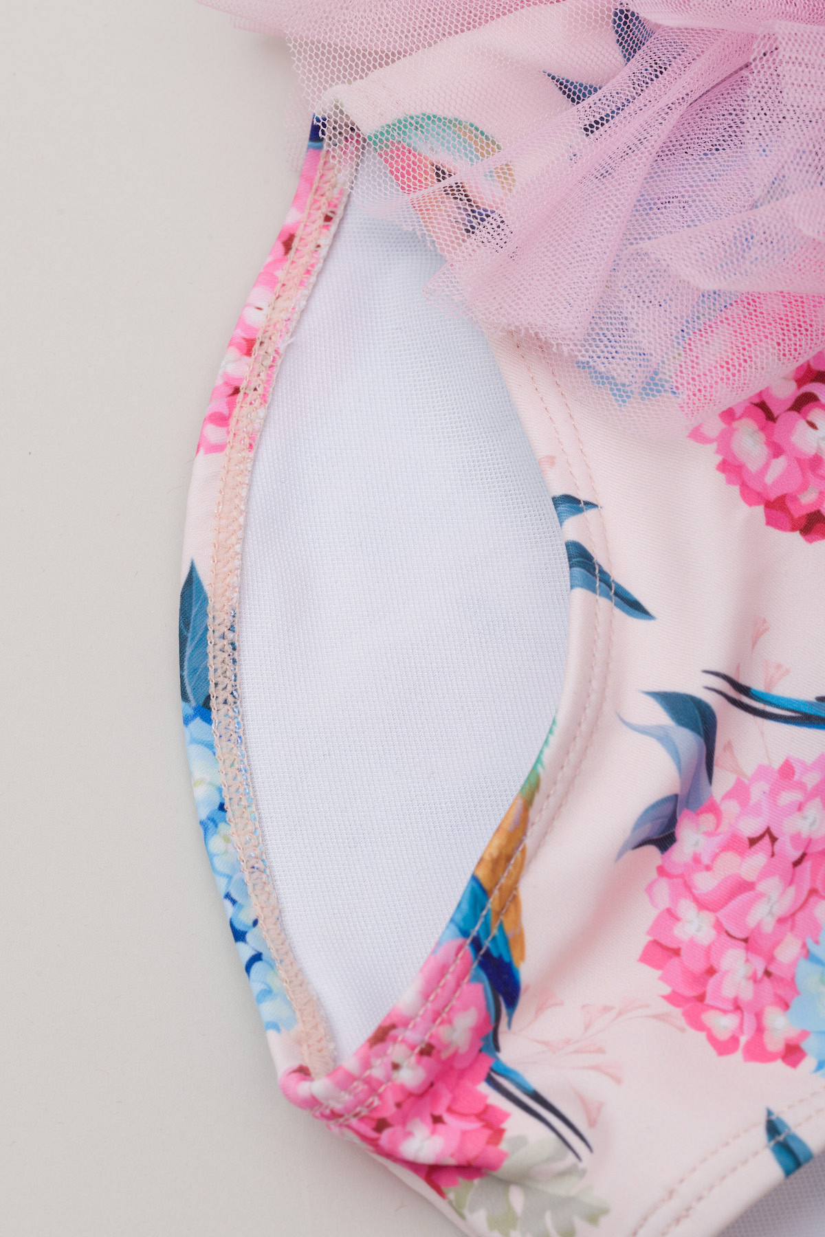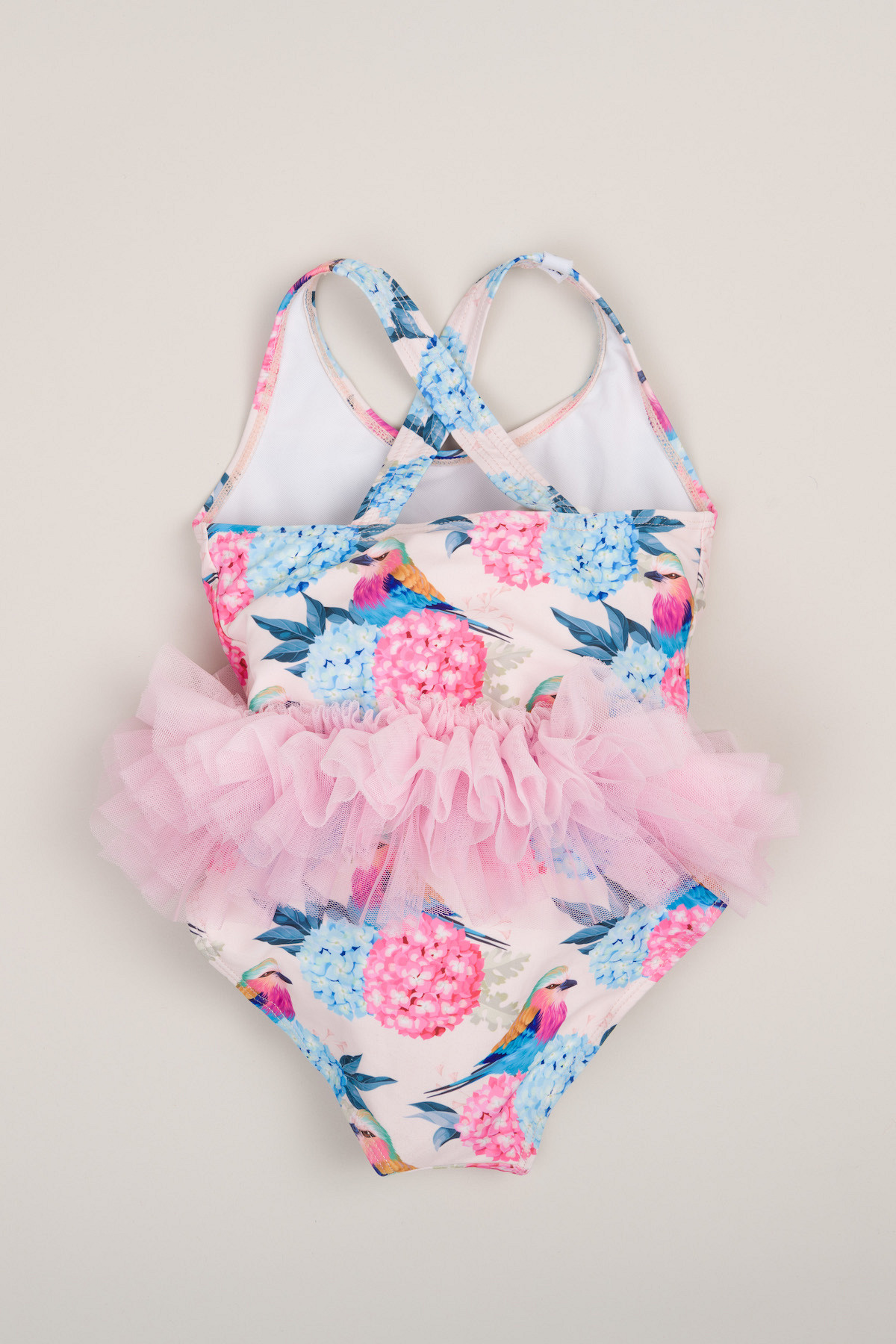 Enodelne kopalke, dvo-slojne, s 4-slojnim tilom za učinek tu-tu krila, odprt hrbet, križ-kraž naramnice, všitek za obešanje (na notranji strani)