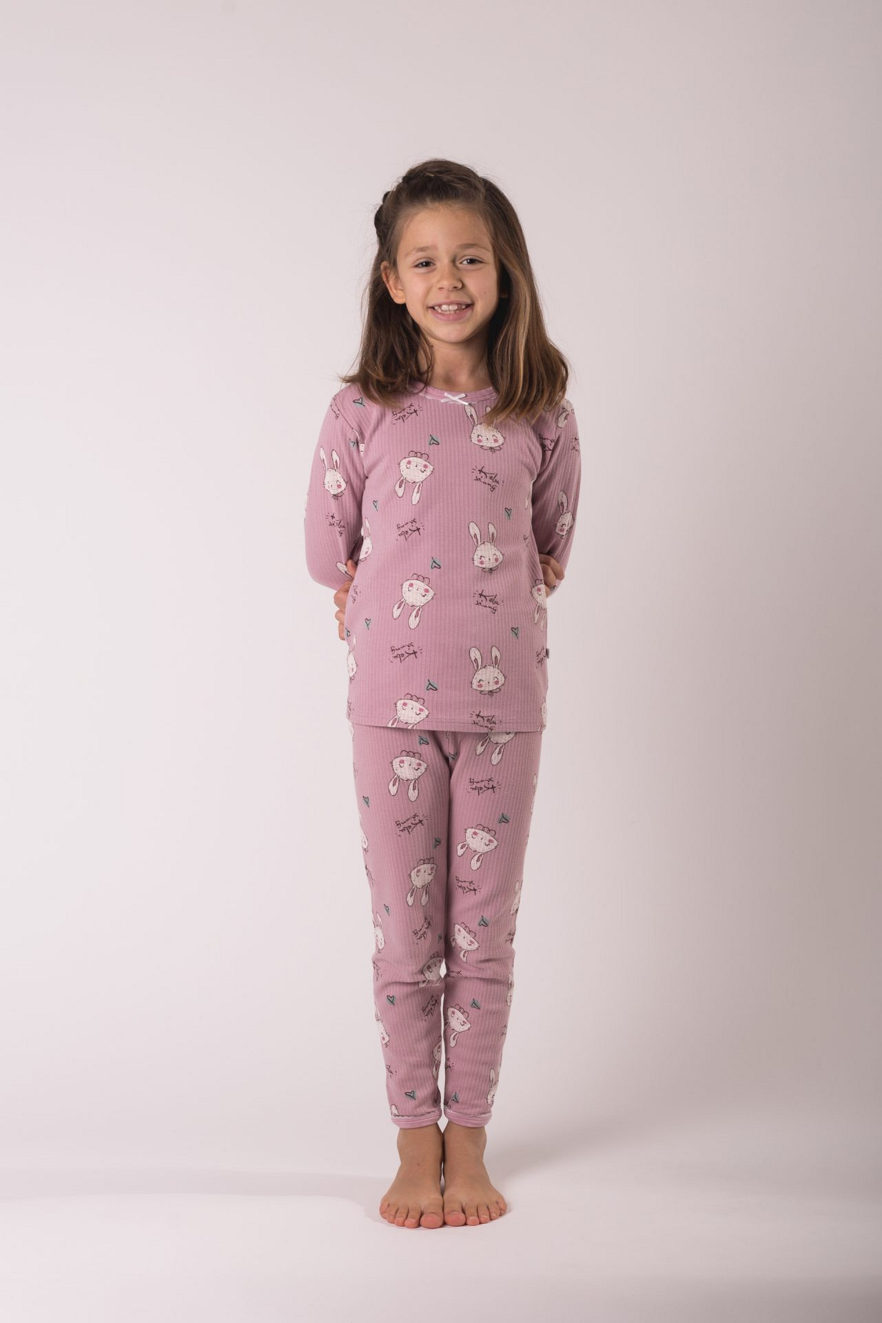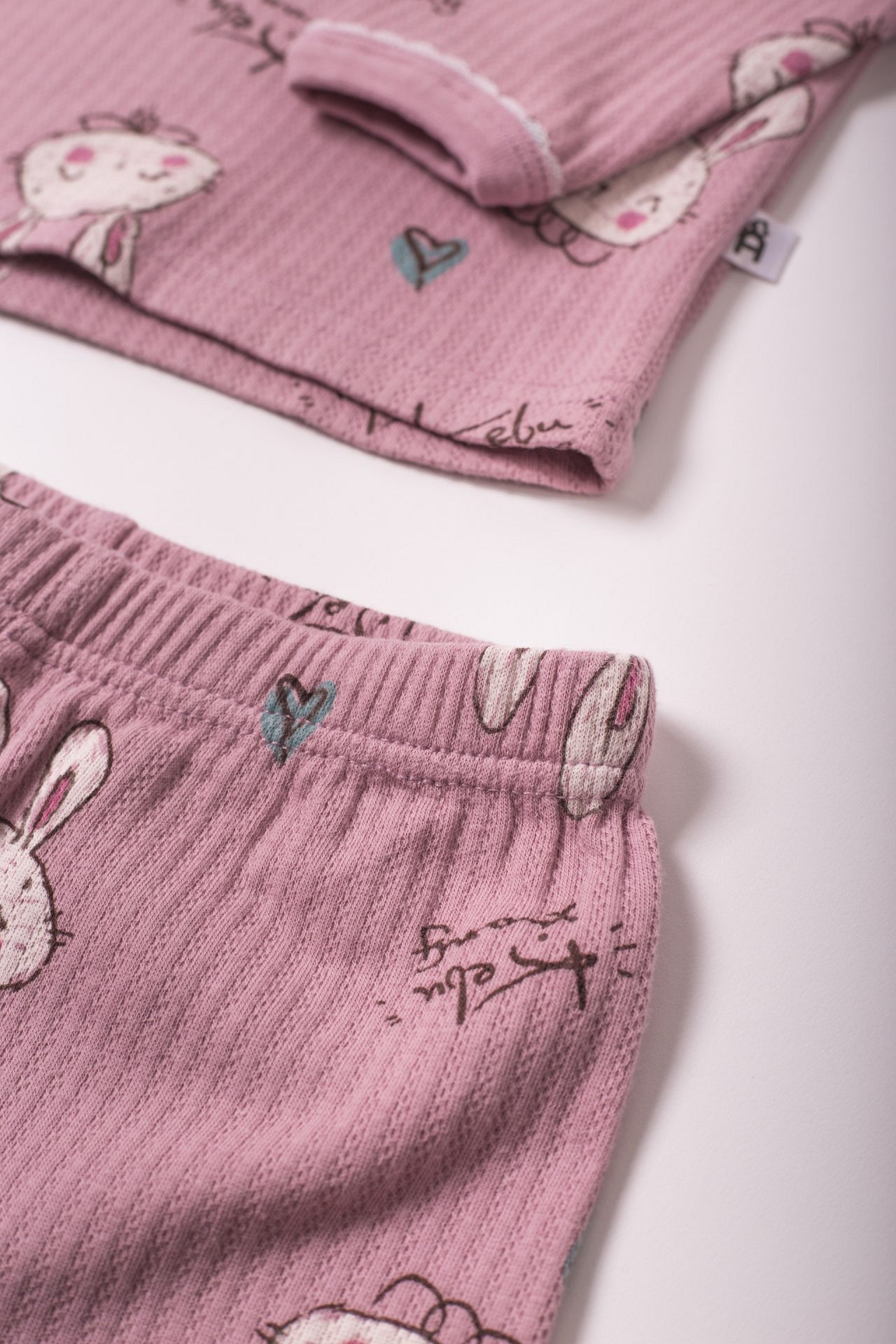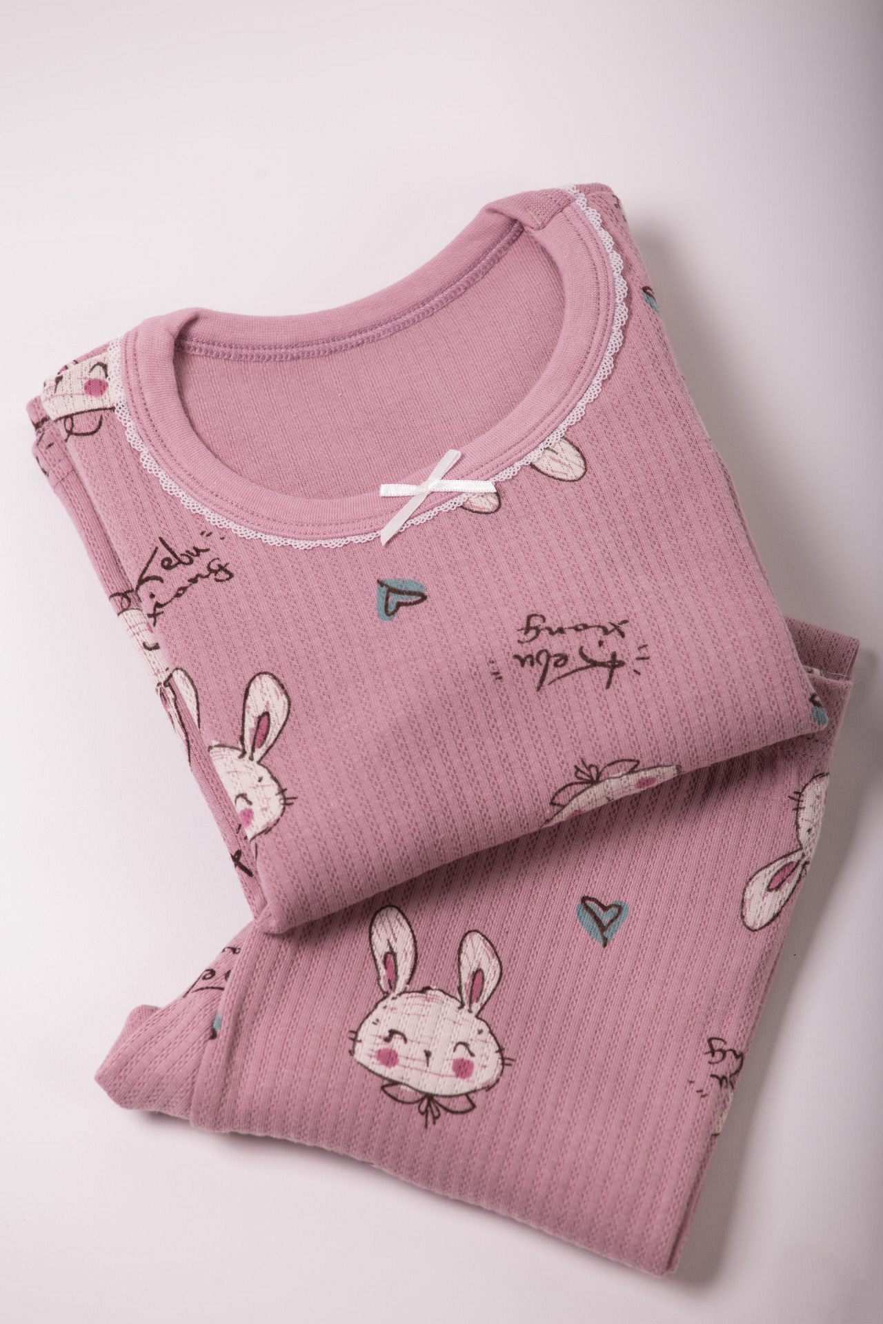 Pižama, s potiskom zajčkov, dolge hlače z elastiko v pasu in dolga majica z O izrezom, dekorativega pletenja, prijetna, udobna, s čipko in pentljico, telirana.