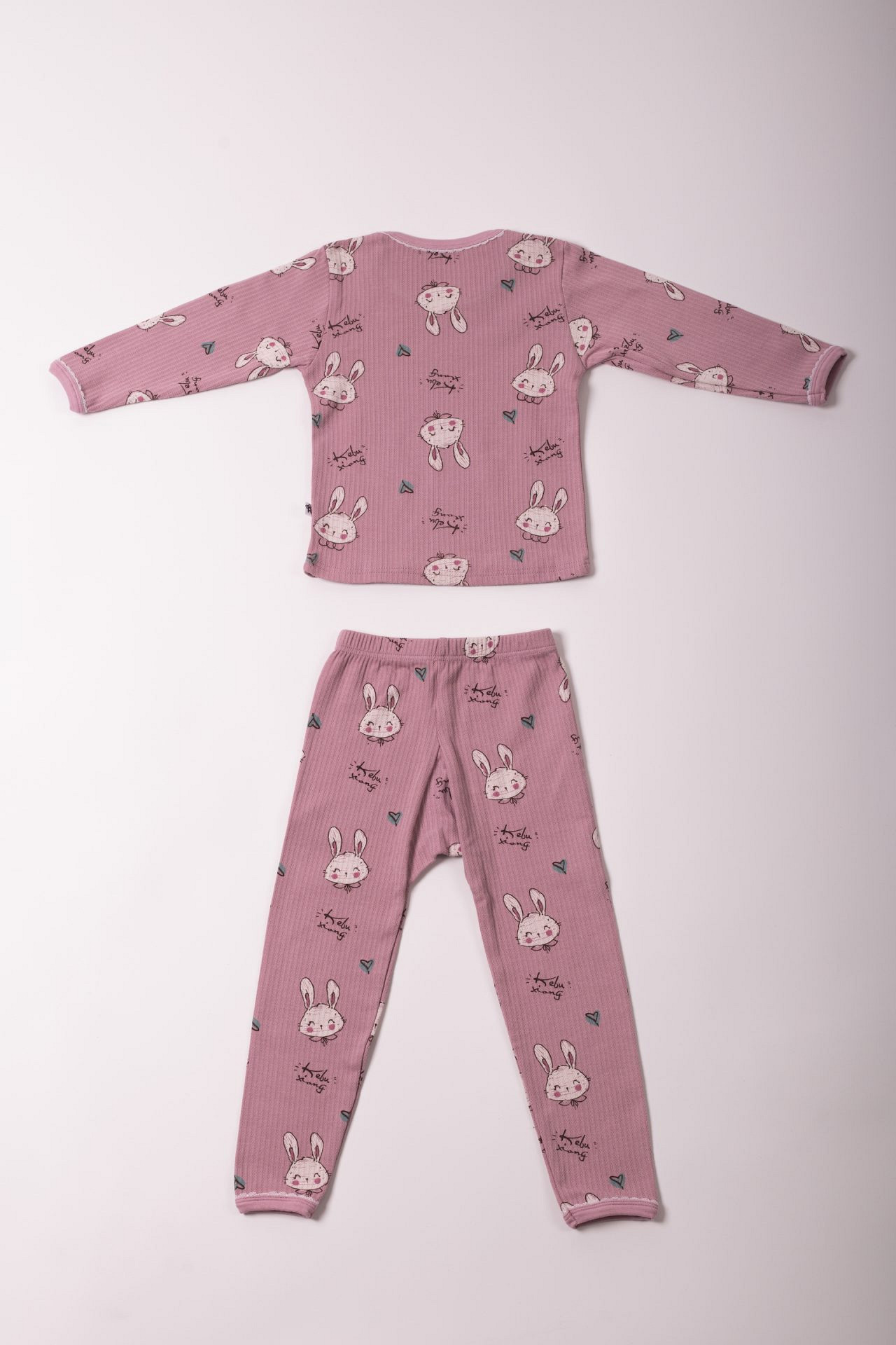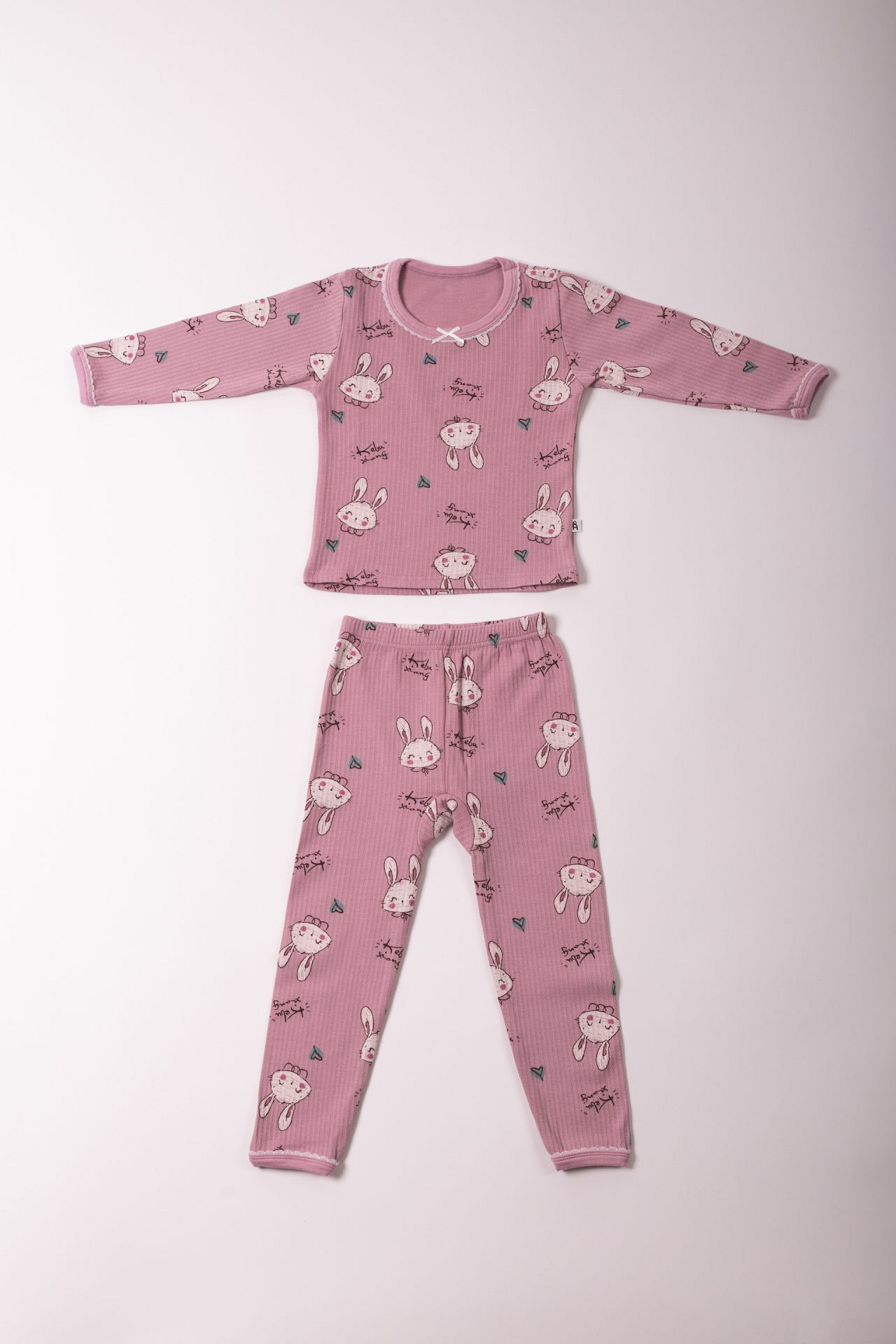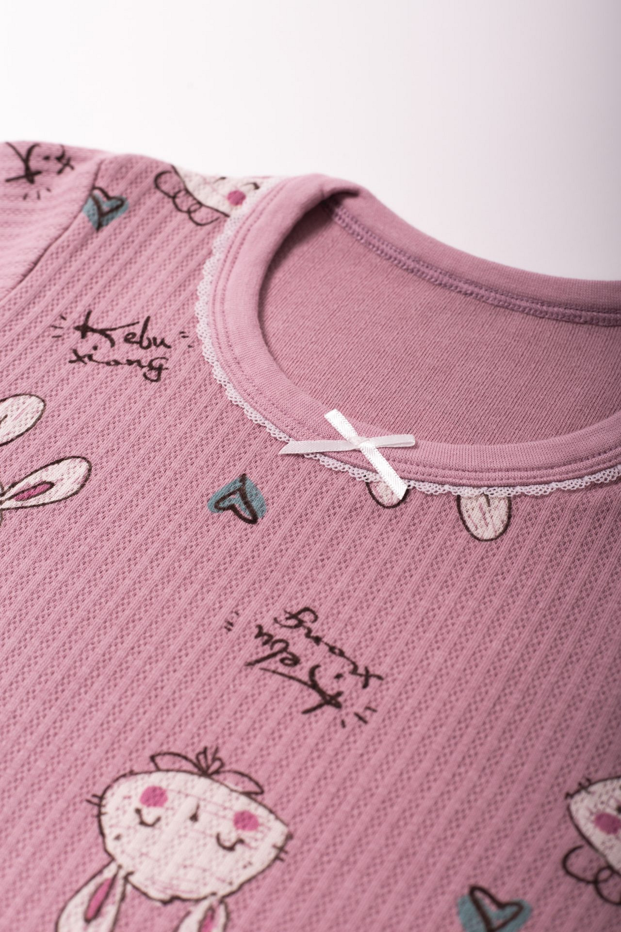 Pižama, s potiskom zajčkov, dolge hlače z elastiko v pasu in dolga majica z O izrezom, dekorativega pletenja, prijetna, udobna, s čipko in pentljico, telirana.